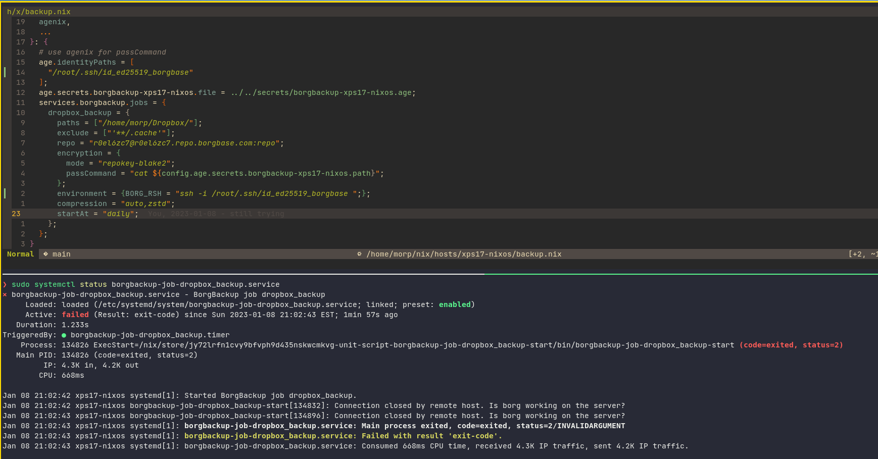 I am trying to backup my dropbox directory from my home directory to borgbase.com. I following this blog post: https://xeiaso.net/blog/borg-backup-2021-01-09 and I have looked at NixOS 24.05 manual | Nix & NixOS and https://nixos.org/manual/nixos/unstable/options.html#opt-services.borgbackup.jobs but I cannot seem to figure out the issue with why I am not the backup is not starting on borgbase. I have copied my root ssh public key to borgbase website too.
