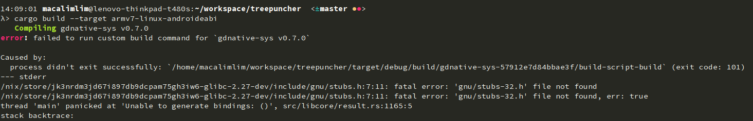 Hi, I’m trying to compile rust source code into a library (lib*.so) that can be used by android devices. However I got stuck when the cargo build command cannot find the stubs-32.h of a particular glibc-dev. I checked the other glibc-devs inside /nix/store and they have that header file. How can the glibc-dev that is used by my system get that header file? Thanks for the help ![]()