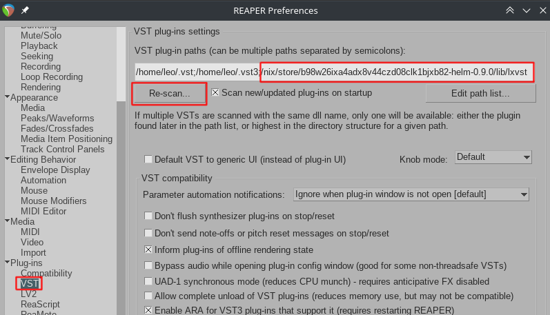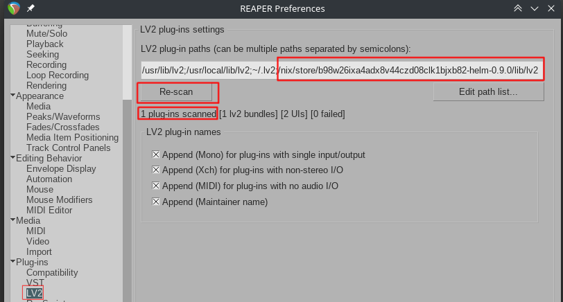 I used the full absolute path here because I was testing it in a nix shell, but you should be able to something like /home/yourname/.nix-profile/lib/lv2 (double check if the folder helm is present in case home manager puts it somewhere else… also, avoid using ~/ as a shortcut for your home as I’m not sure if reaper can interpret it).