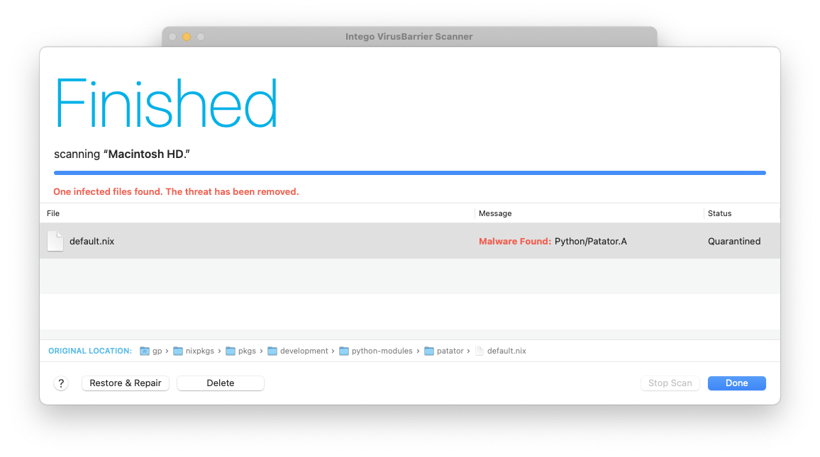 Problem reproduces as seen below with the default.nix file getting quarantined as Python/Patator.A during step 3.