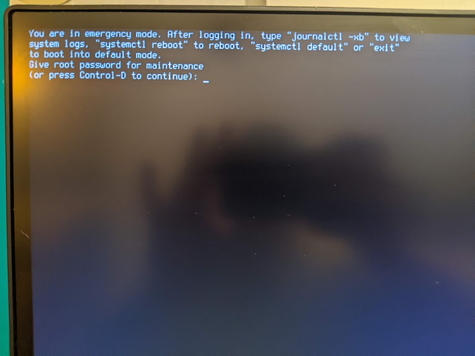 C-d just brings me back to this same prompt. Rebooting from either the root shell option, or just normally turning the system on results in this prompt at start up.