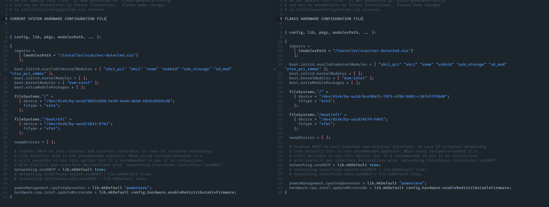 I took a screen shot of my currently running non-flakes based system, next to the one in my repo with labels at the top: Current system is on the left, flake is on the right.
