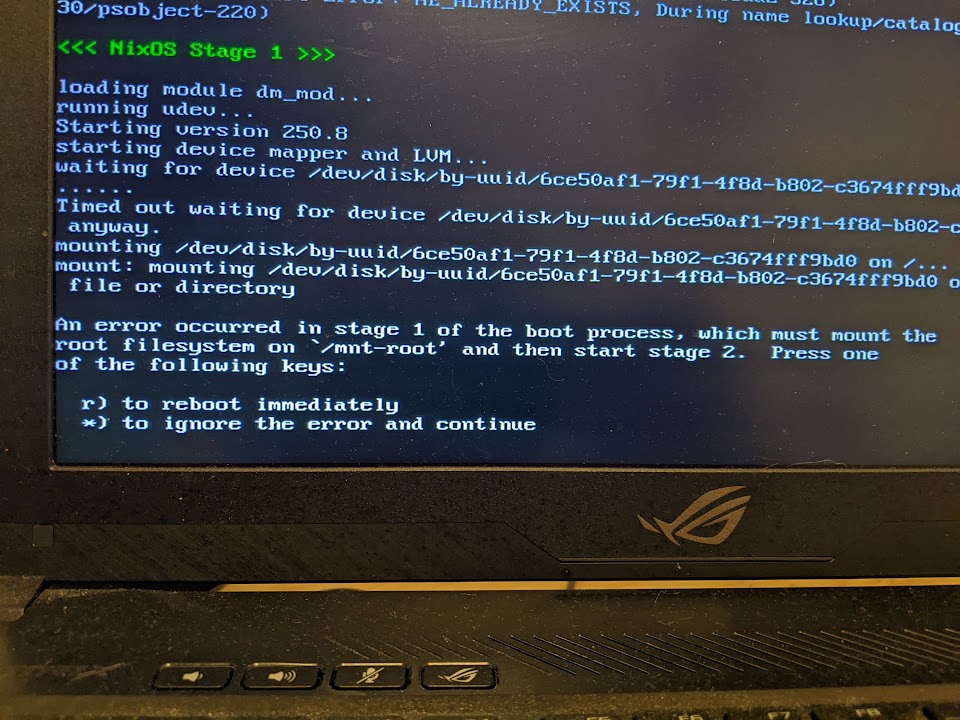 Side note: NixOS really lived up to one of it’s selling points through this. I had fallback.configuration.nix in my repo, that was a copy of my pre-flakes conversion configuration. So once I started having issues, I just dropped that in instead during the install, and was back to a working system. Makes it so much easier to learn and experiment.
