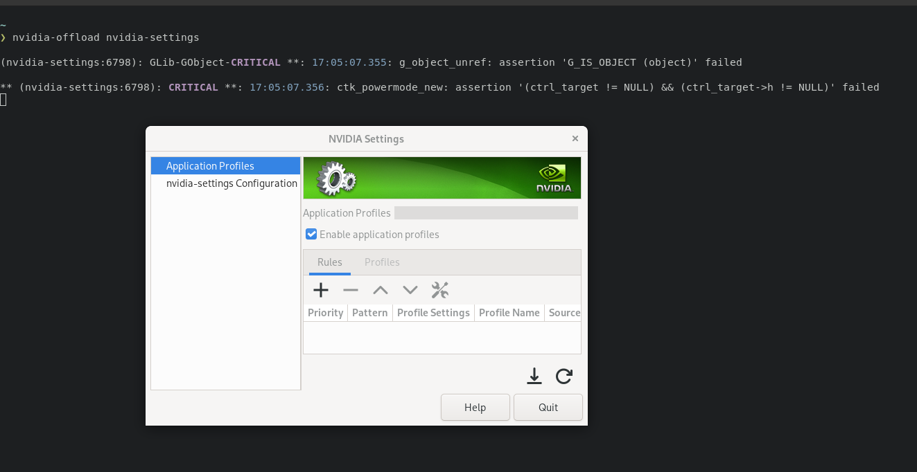 And yet nvidia-settings still doesn’t show the nvidia configuration, but I’m managing to run the programs using nvidia-offload and they appear running in nvidia-smi, I believe I’m having a problem in the nvidia-settings UI and not in nvidia itself. I’ll try a few more things.