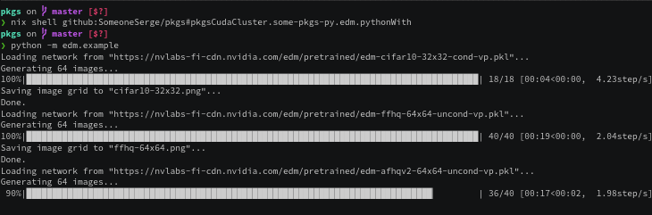⯠nix shell github:SomeoneSerge/pkgs#pkgsCuda.some-pkgs-py.edm.pythonWith --command python -m edm.example